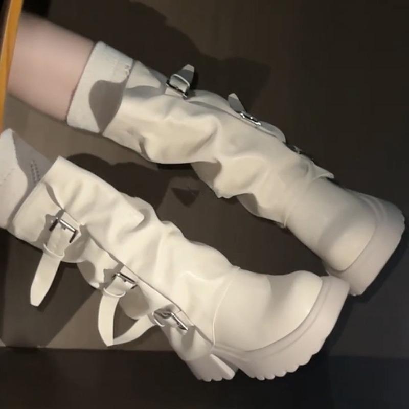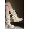 Stiefel Damen Cremeweiß Runde Spitze Gürtelschnalle Hosenstiefel Kleine Dicke Sohle Mittelhohe Ritterstiefel