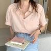 Koreanisch-Französisch Blaues Milchaufhellendes Damen-Kurzarmhemd mit Revers- und Taschendesign