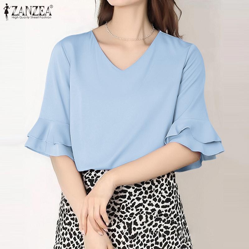 ZANZEA Womens Casual V-Neck Solid Color Loose Half Sleeve Blouse
