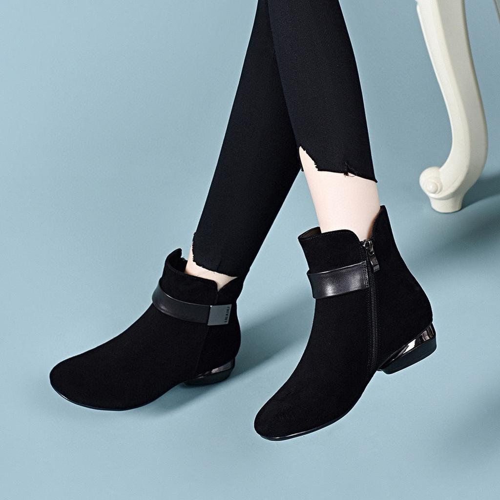 Rundkopf Kurzstiefel Damen Herbst und Winter neu niedrig Absatz eckige Schnalle schwarz Schafsleder Baumwollstiefel Damen Lederstiefel lässige flache Stiefel