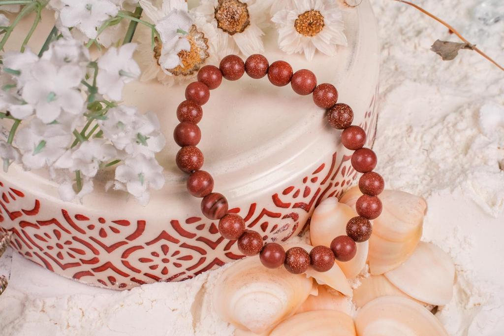 Das elegante Goldstein-Energiearmband. Dieses Armband, gefertigt aus schimmernden rötlich-braunen Perlen, ist nicht nur visuell fesselnd, sondern auch spirituell stärkend.. Oft als "Stein des Ehrgeizes" bezeichnet, wird angenommen, dass Goldfluss Selbstvertrauen, Motivation und positive Energie fördert.