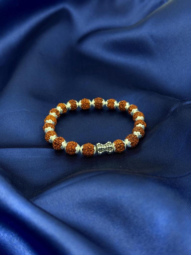 The Rudraksha Bead Bracelet, adorned with detailed silver-toned spacers. Handcrafted with authentic Rudraksha seeds, this bracelet is more than just an accessory — it’s a spiritual companion known for its calming and protective properties. Whether worn for prayer, meditation, or daily mindfulness, this bracelet supports inner peace and emotional balance with every bead.