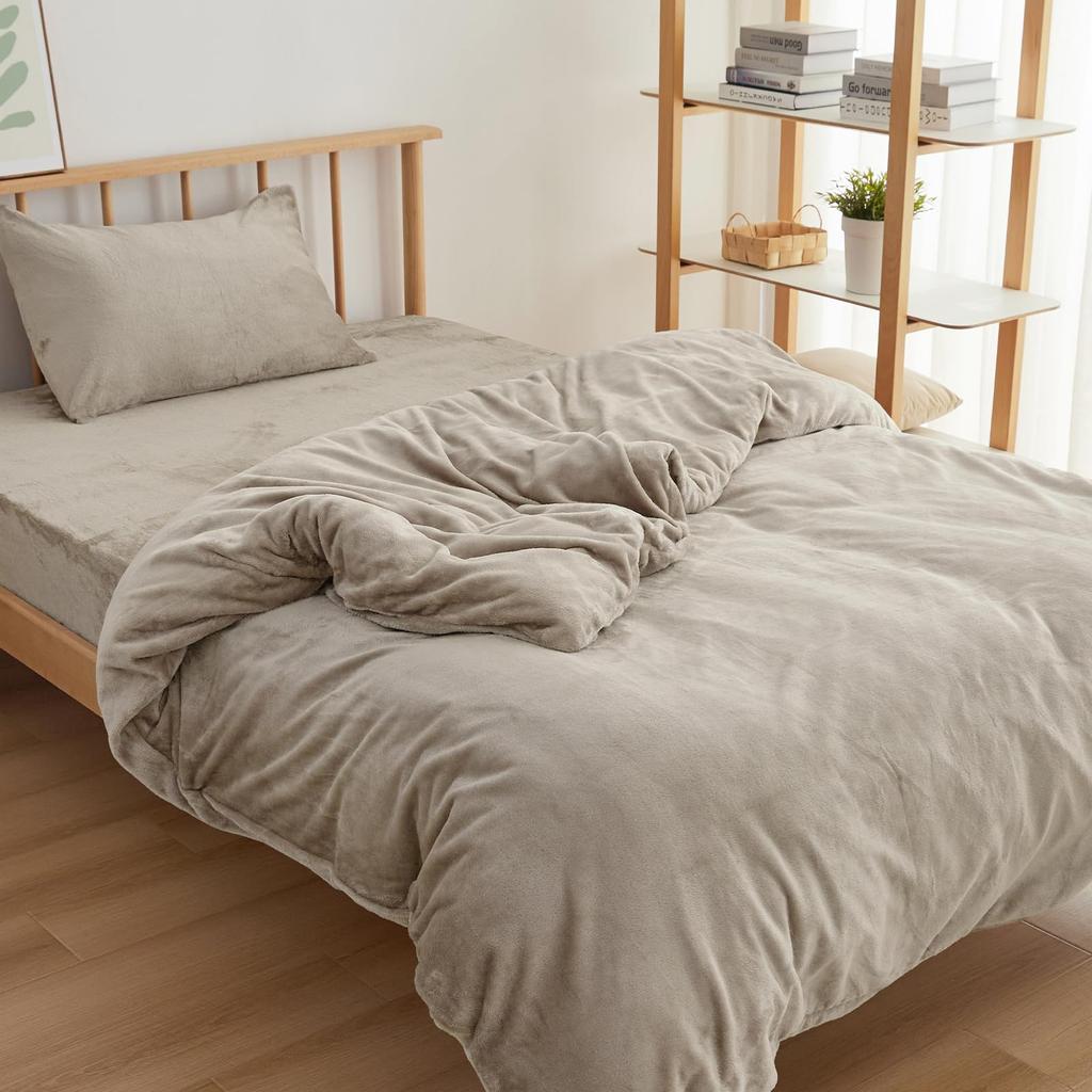 Set contents and specifications: Duvet cover (190*210cm), fitted sheet (140*200+30cm), pillowcases (45*65cm). 1. Duvet cover (1 piece): Full-zip on one side with 8 ties. 2. Fitted sheet (1 piece): Fitted sheet with elastic around the perimeter to prevent slippage. 3. Pillowcases (2 pieces): Matching type. Material: Microfiber (flannel).