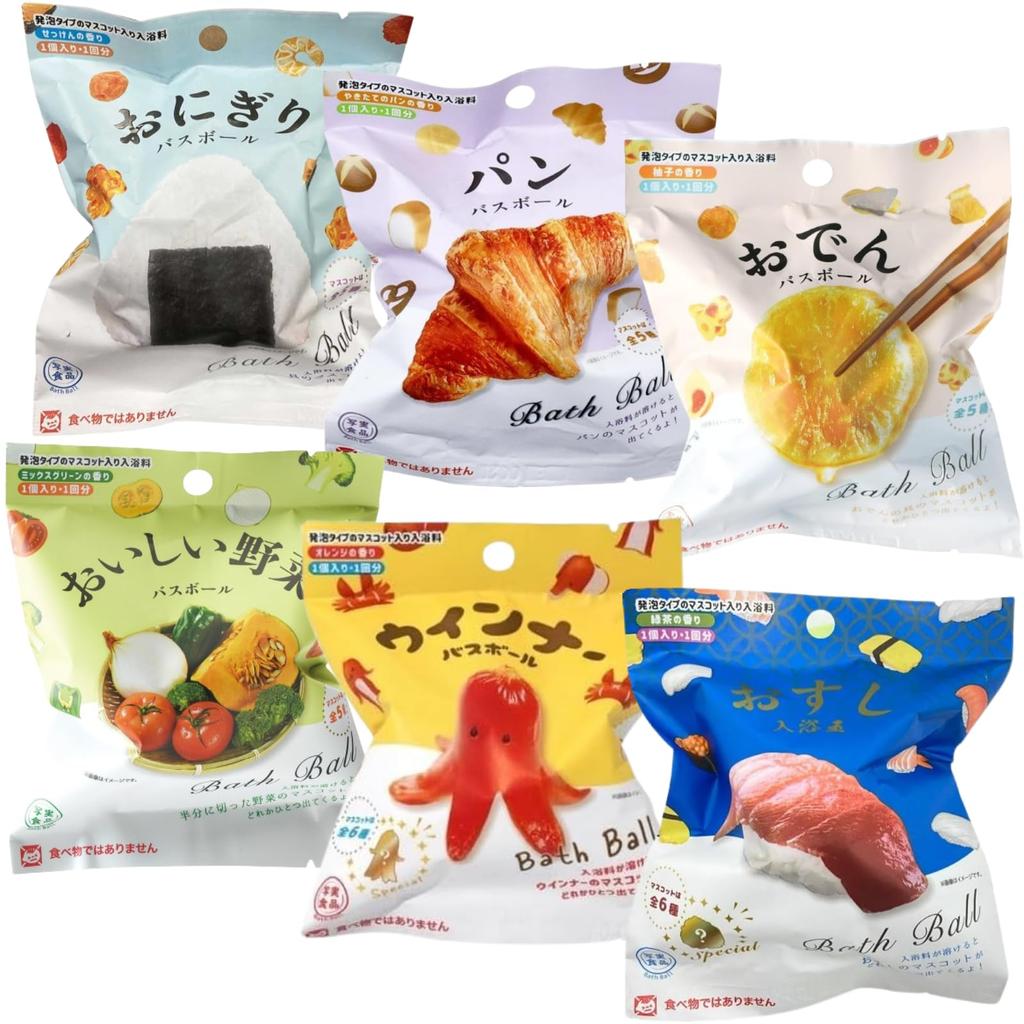 Dies ist ein Sortimentsset aus sechs Bällen aus der beliebten realistischen Lebensmittelserie von Nor Corporation (Reisball, Brot, Oden, Wurst, Sushi und köstliches Gemüse), jeweils mit einem von jedem. Es enthält auch ein praktisches Schaumnetz für die Badezeit.