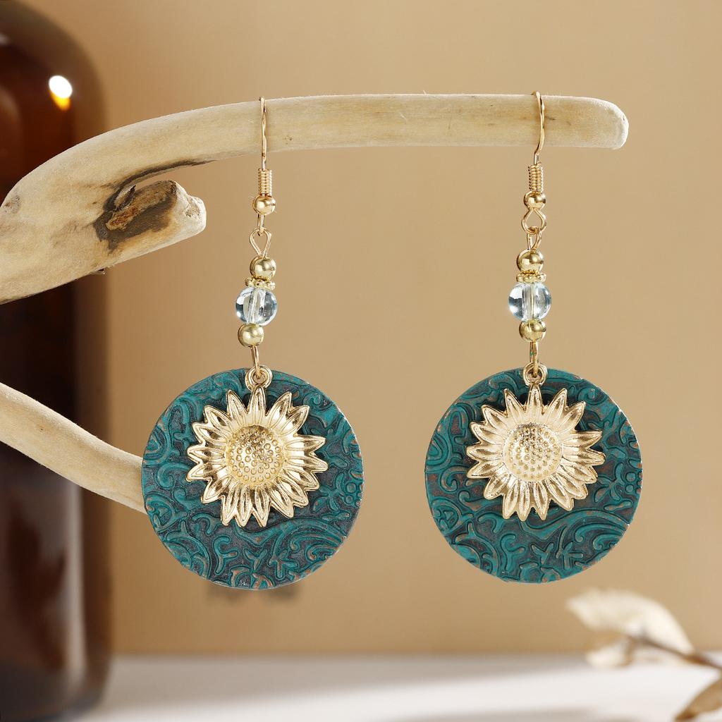 European, American Bohemian Two-color Double-layer Sunflower Exquisite Pattern Earrings Retro Earrings