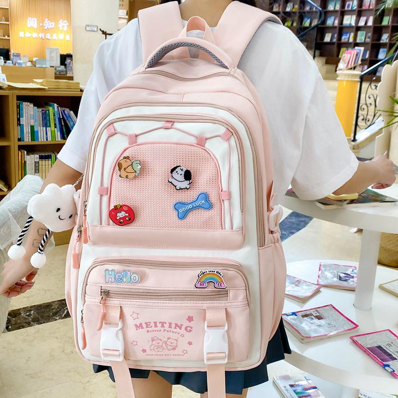 The new schoolbag is cute, small and fresh. The high-value schoolbag for high school students contrasts colors. The multi-compartment backpack