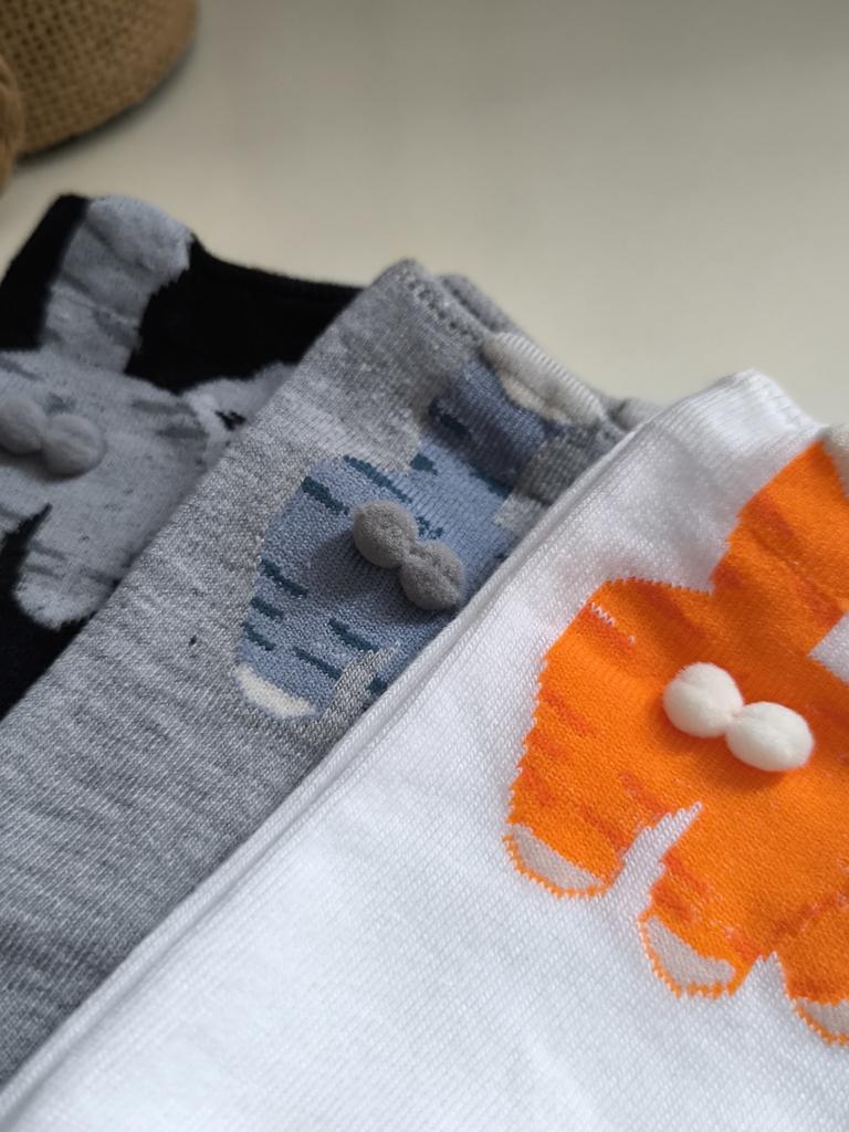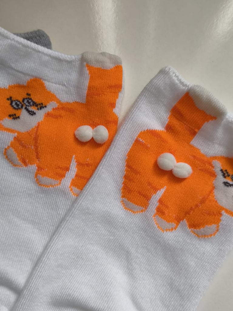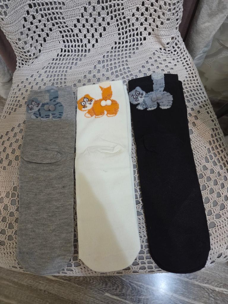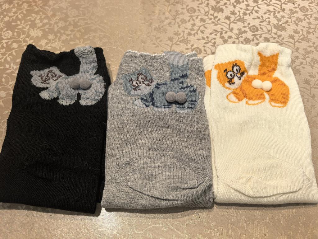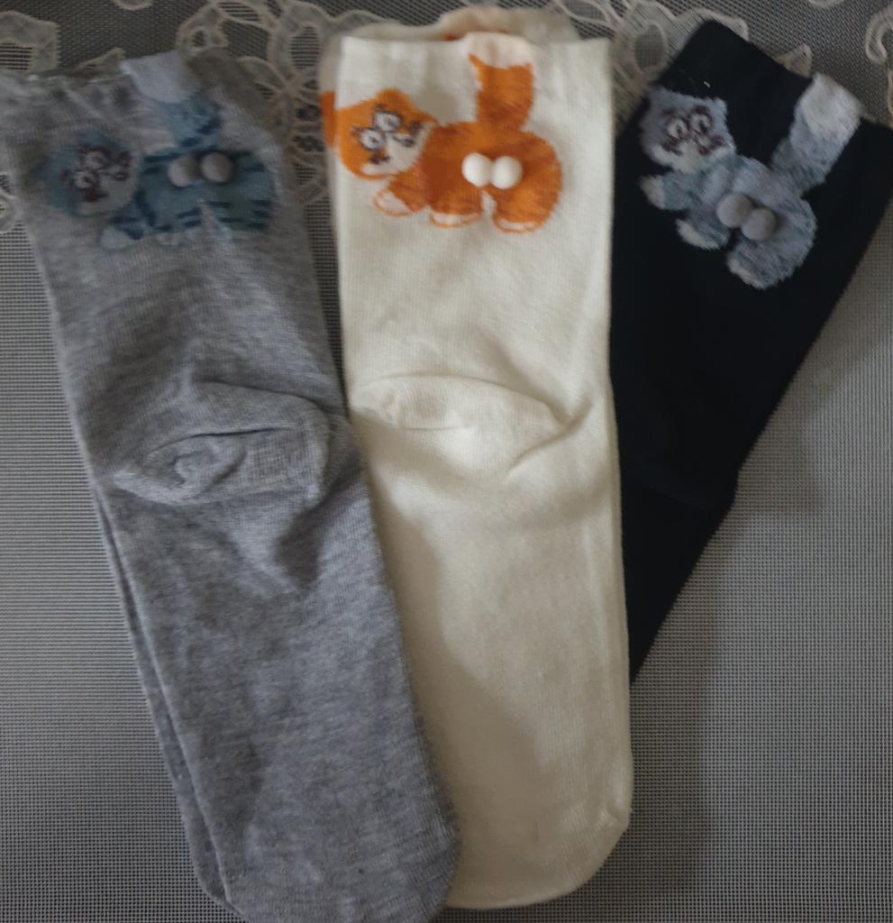 Drei Paar süße Socken mit Kätzchen sind immer nützlich. Die Socken sind dünn und dehnbar.
