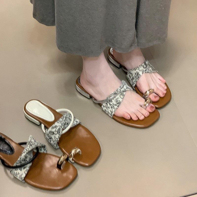 Fashion temperament Metal buckle cover toe low heel cool slippers summer silver French flip-flops outer wear