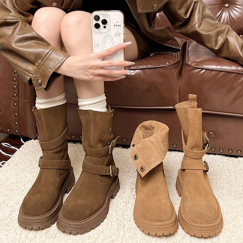 Gürtelschnalle dicker Absatz Retro Mid-Stiefel 2025 Herbst dicksohlige Maillard schlanke Martin-Stiefel Muffin Ritterstiefel