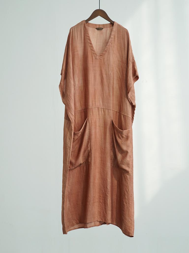 Johnature Women Vintage Dress V-Neck Half Sleeve Loose Solid Color Patchwork Pockets Summer Dress