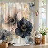 1 Eleganter floraler Duschvorhang, Beige und schwarze Mohnblumen, Goldene Mitte, Grau-weißer Hintergrund, Mit Haken, Polyestergewebe