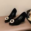 Frühlings- und Herbst-Keilabsatz-Modeschuhe Schwarz High Heels Strass Perle Quadratische Schleife Große Größe Arbeitsschuhe