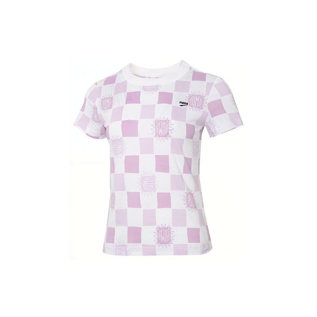 Puma Downtown Aop Tee Checkered Logo Sports Casual Breathable Round Neck Short Sleeve T-Shirt Women Tops Light-Purple 535379-02