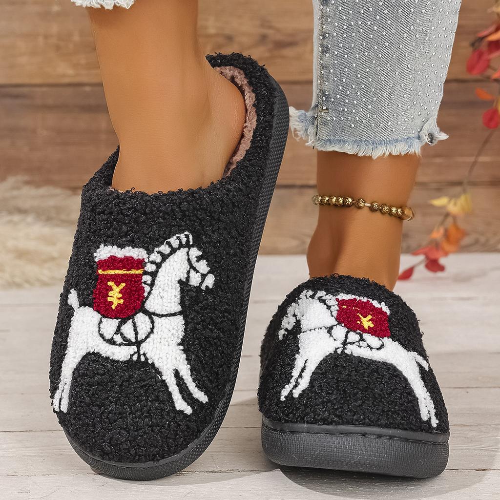 Mode Plüsch Zuhause Dicksohlige Bequeme Plüsch Baumwollpantoffeln mit Tier Muster Stickerei, Niedliche Warme Rutschfeste Hausschuhe