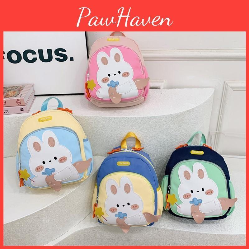 This toddler bunny school bag features a breathable nylon outer shell and a colorful cartoon pattern, designed for young children. It measures approximately 24*5*28 cm, supporting lightweight daily use. The bag includes a padded, curved shoulder strap for comfortable carrying. Ideal for preschool students attending school or educational activities, it resists wear with reinforced stitching and easy to clean with a damp cloth.