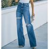 Autumn new high-waisted jeans for women, washed ripped wide-leg denim trousers