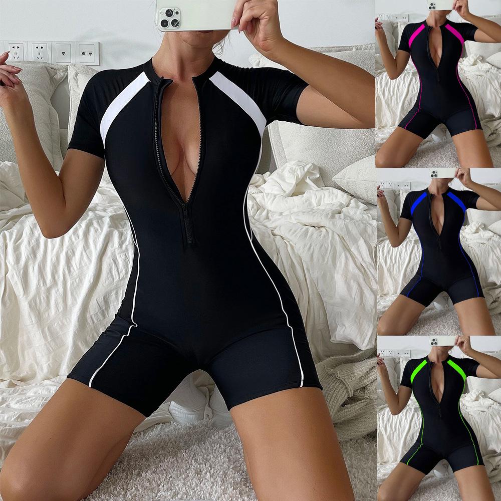 Entdecken Sie die perfekte Mischung aus Stil und Funktionalität mit unserem 2024 Damen Einteiligen Kurzarm-Reißverschluss-Badeanzug, der speziell für Surfen und Strandbekleidung entworfen wurde.. Dieses atemberaubende Stück verfügt über ein schickes Colorblock-Muster, das Ihrer Strandgarderobe ein modernes Flair verleiht.. Der Badeanzug ist aus hochwertigem Polyester gefertigt und bietet sowohl Komfort als auch Langlebigkeit, wodurch sichergestellt wird, dass er den Elementen standhält.. Der praktische Frontreißverschluss ermöglicht einfaches Anziehen, während die kurzen Ärmel zusätzlichen Sonnenschutz bieten, was es zu einer idealen Wahl für aktive Strandtage macht.. Umfassen Sie die Wellen mit Stil und Selbstvertrauen mit diesem Must-Have-Stück.