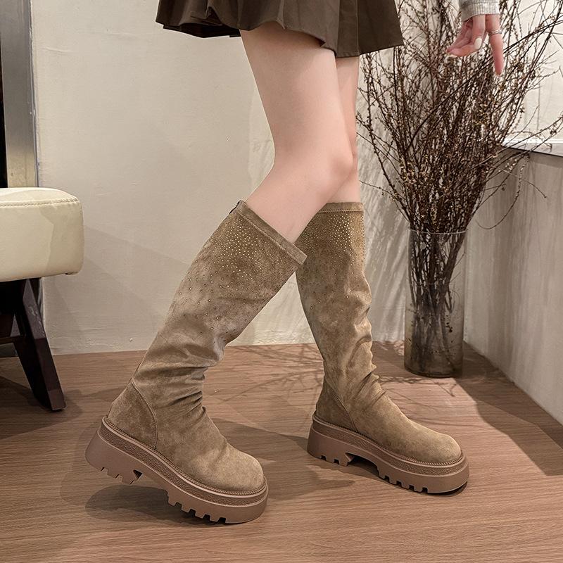 Skinny Stiefel Khaki Stiefel dicker Absatz 2025 Herbst und Winter Ritterstiefel kleiner Mann aber Knie elastische dünne Stiefel