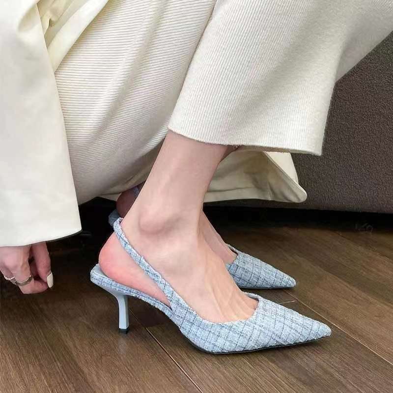 2025 neue Frühling- und Sommer-Koreanische Version kariert farblich passend hochhackige Einzel-Schuhe spitze Zehen flacher Ausschnitt hinten dünner H