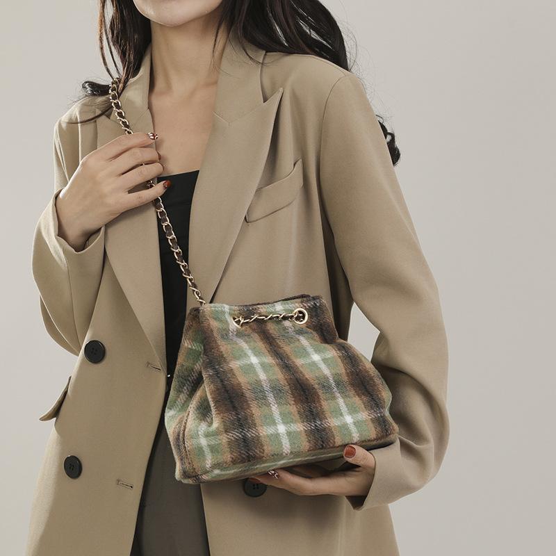 Eimerbeutel aus Wolle mit Karomuster, neuer Trend, modische und vielseitige Damen-Handtasche im hochwertigen Nischendesign