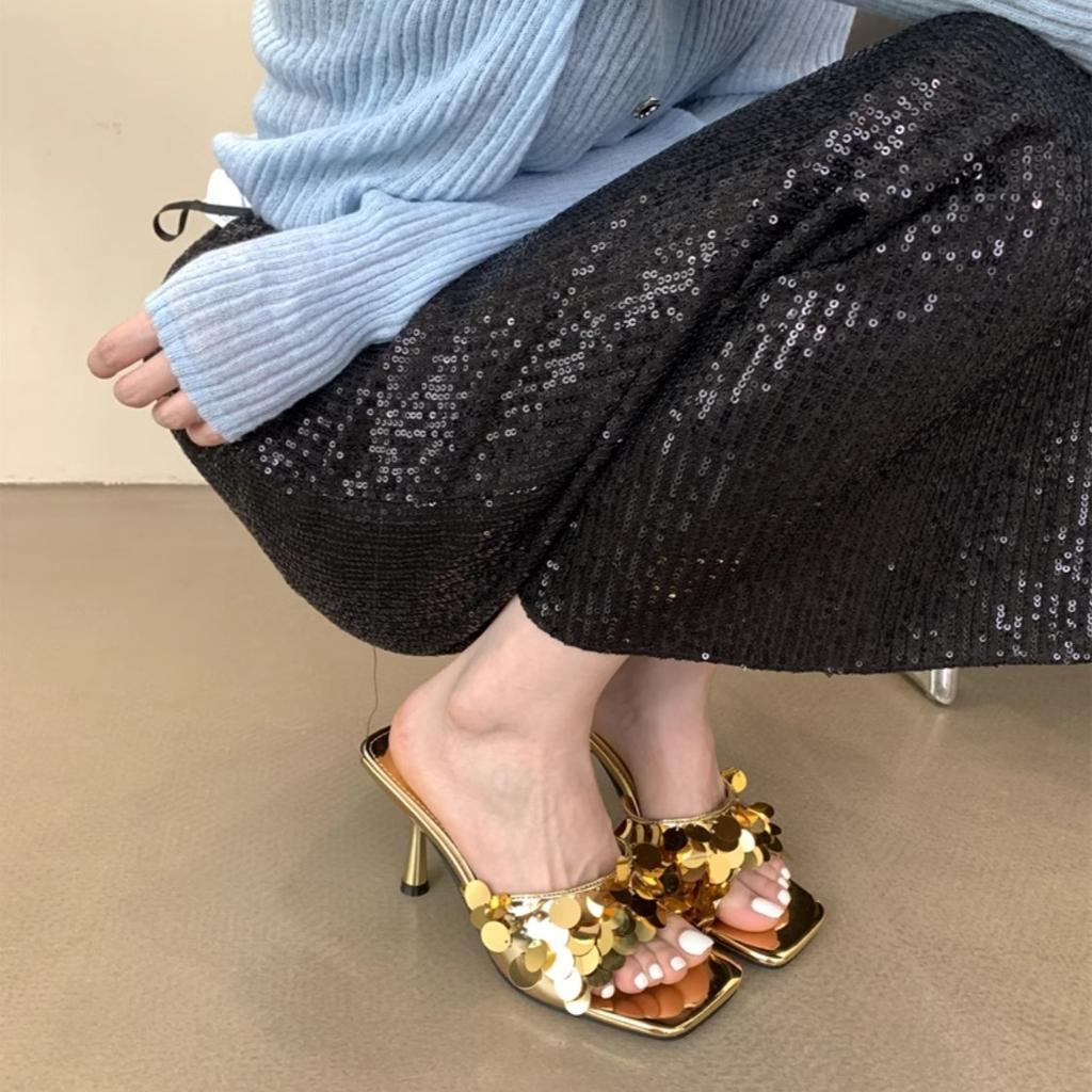 Hongkong vielseitige Pailletten coole Hausschuhe 2025 Sommer neu Temperament Feenstil Ein-Wort-Slipper offene Zehen Stiletto Mules