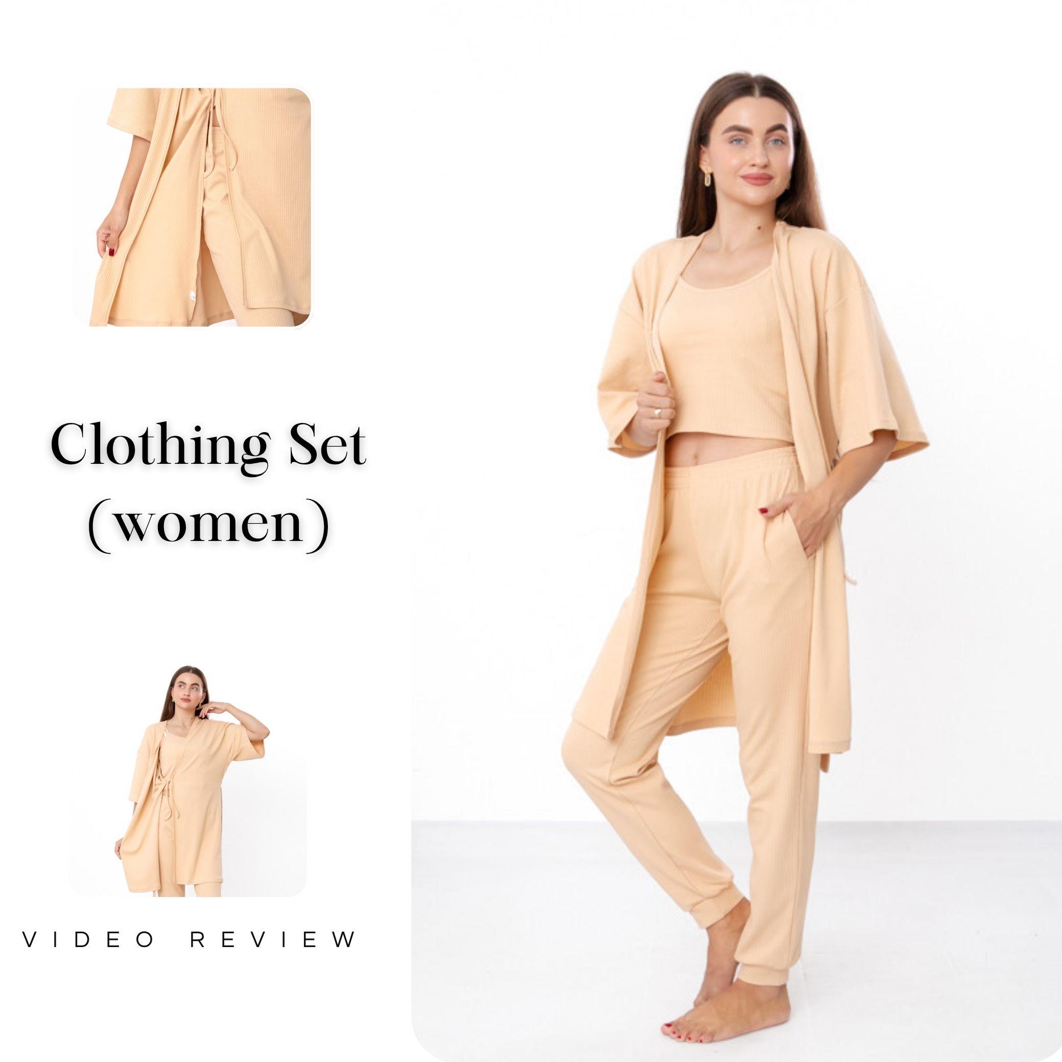 A women’s set consisting of a robe, top, and pants is a stylish choice for home, relaxation, and travel. Made from natural interlock with a needle-out texture, it combines softness, elasticity, and practicality. The fabric feels pleasant on the skin, is breathable, absorbs moisture well, and maintains a neat look even after multiple washes. Thanks to its universal design, this set pairs easily with other wardrobe items, allowing you to create both casual and more refined home looks.