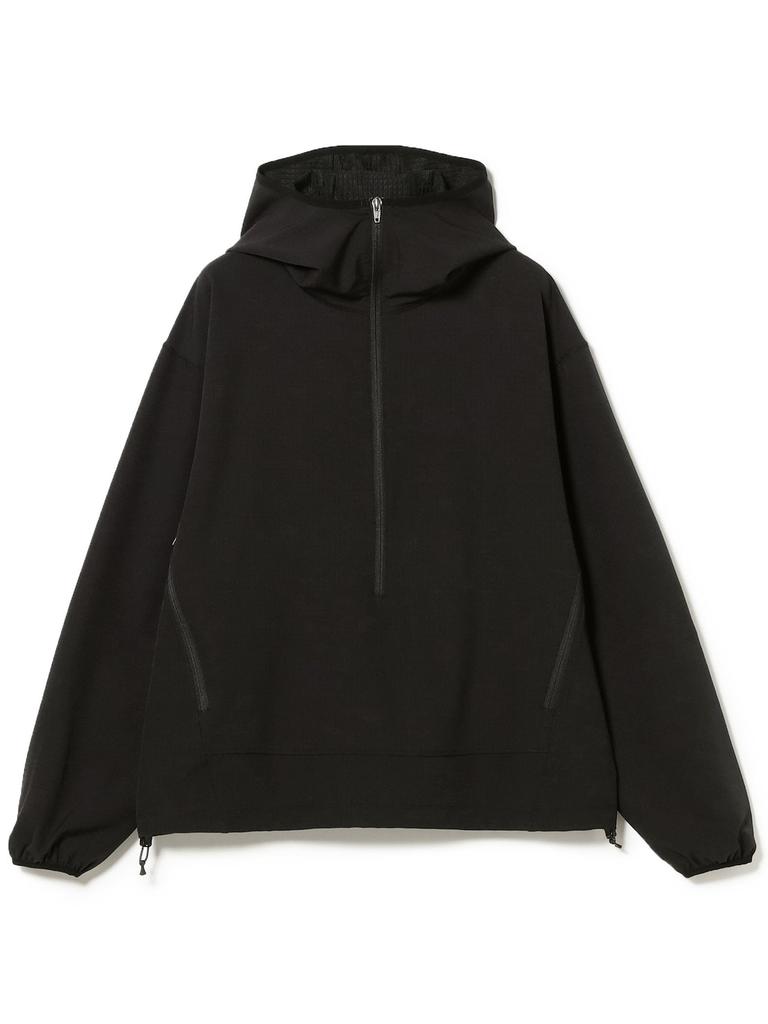A water-repellent half-zip hoodie with a hood that covers the chin.