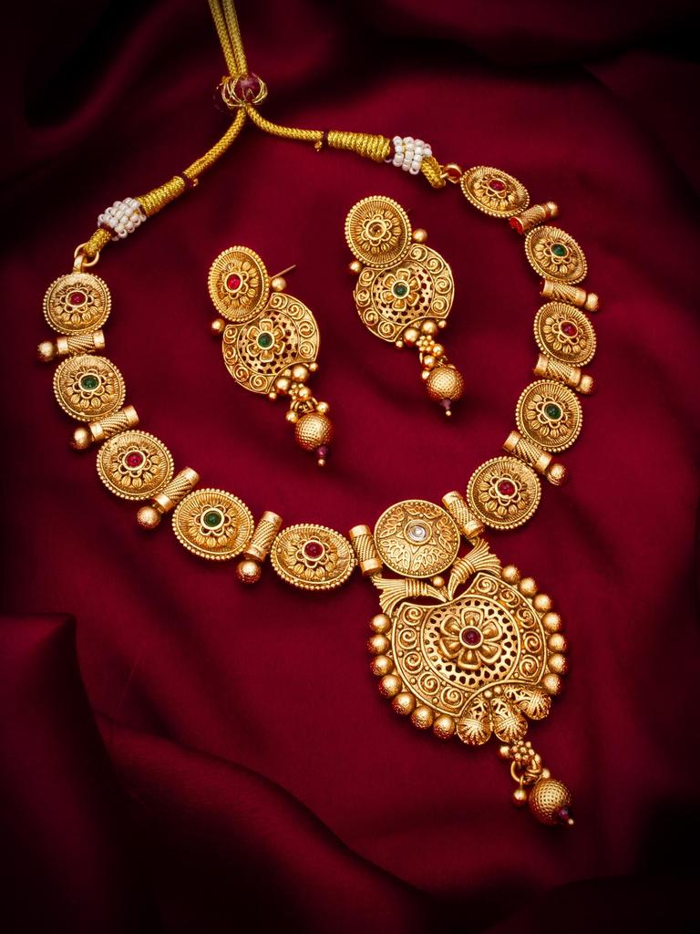 Gold-Plated White Stone-Studded & Beaded Temple Jewellery Set