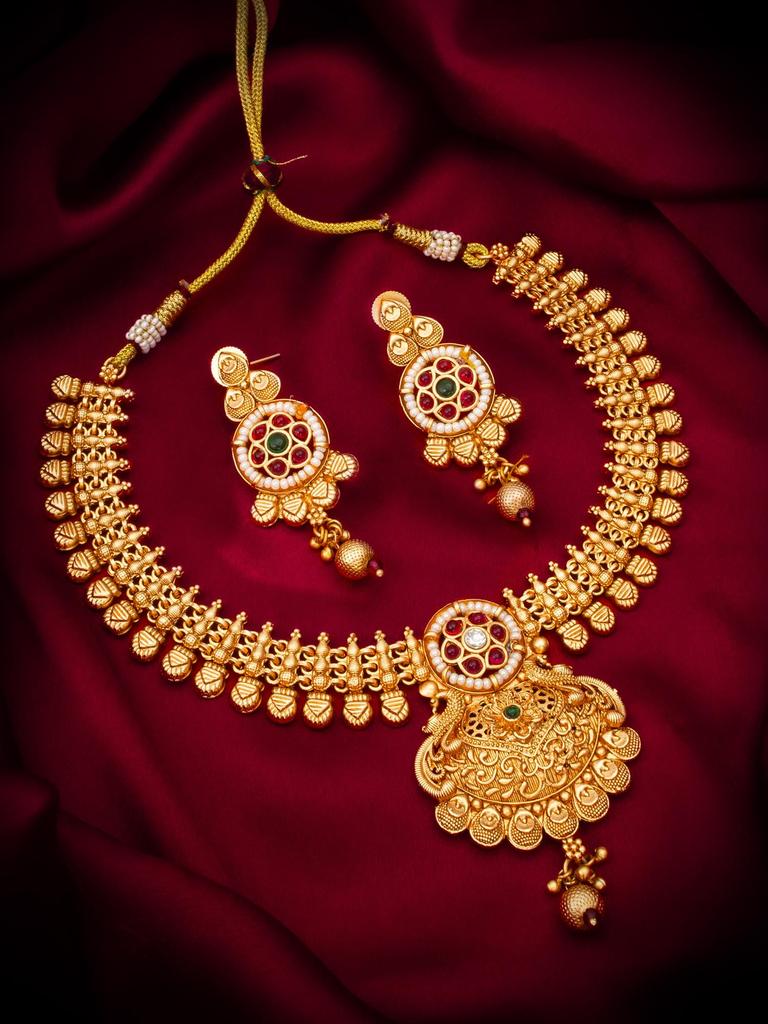 Gold-Plated White Stone-Studded & Beaded Jewellery Set