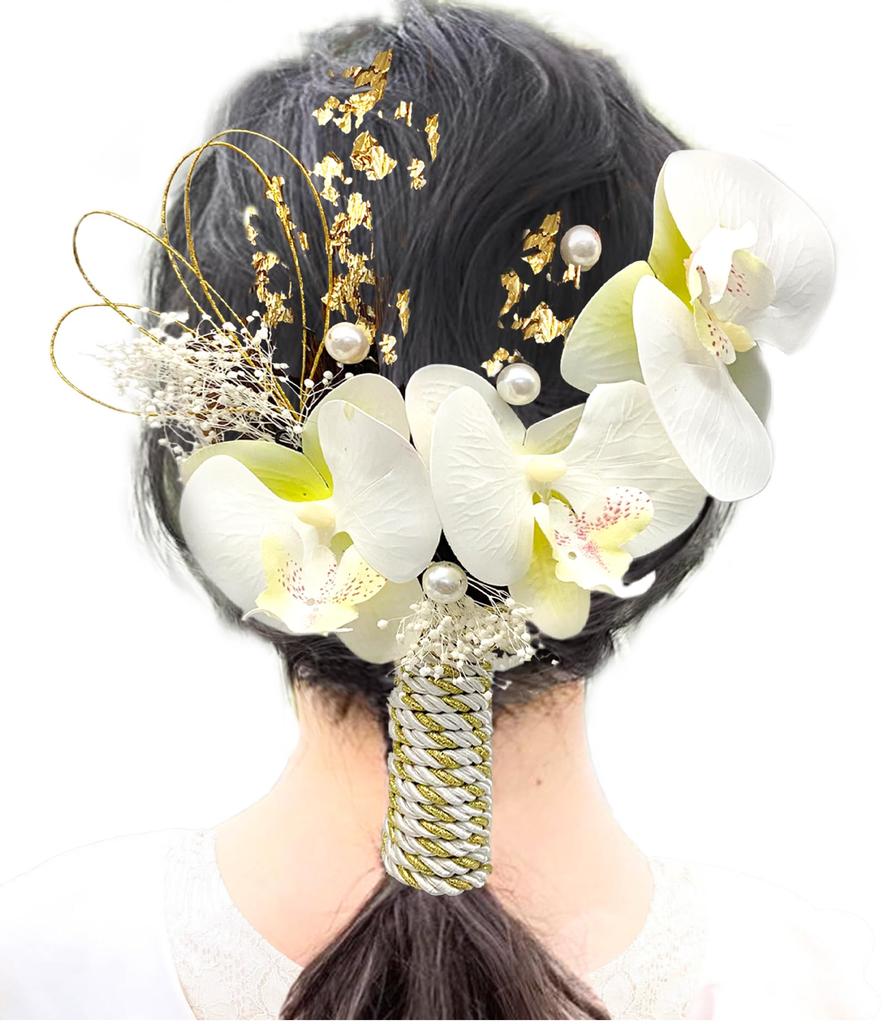 [Simple and stylish] This 15-piece hair ornament set features three Phalaenopsis orchids, a small piece of mizuhiki, ten white pearl pins, and gold leaf.