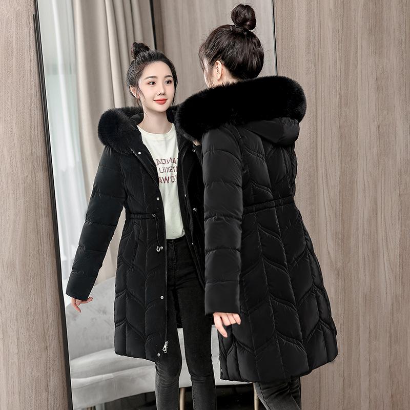 Daunenjacke für Damen Winter Neuer Stil Großer Pelzkragen Mittellang Verdickt Taille Baumwollgepolsterte Jacke