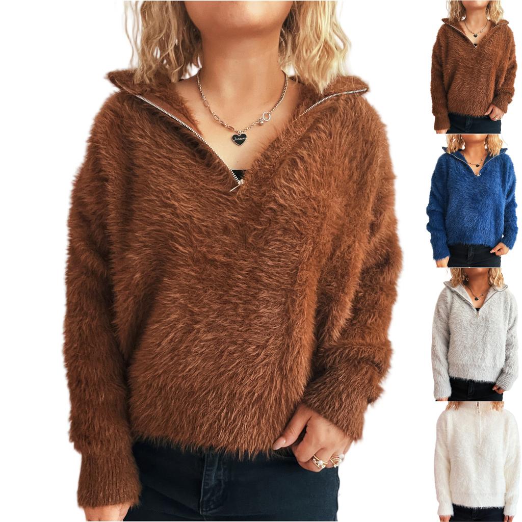 Damen Einfarbig Kurz Lässig Revers Halber Reißverschluss Gestrickt Modisch Oberteil Pullover
