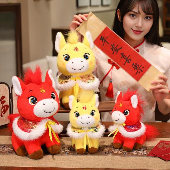 Die festlichen Farben schaffen ein Gleichgewicht zwischen traditioneller chinesischer Neujahrsessenz und moderner Ästhetik und sprechen alle Altersgruppen an.. Verleihen Sie Ihrem Raum einen Hauch von Glück und Charme mit dieser entzückenden Pferde-Plüschpuppe 2026.