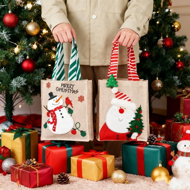 1-10 Stück Weihnachts-Jutesäckchen mit Santa- und Schneemann-Design, Handliche Süßigkeitentüten für Gastgeschenke und Dekorationen für die Weihnachtsfeier
