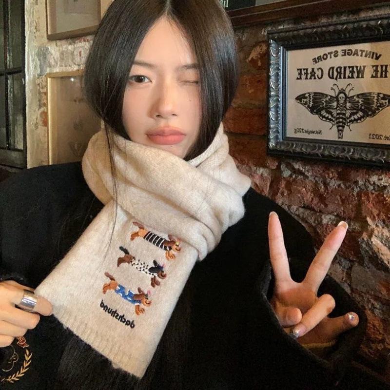 Niedlicher Welpe Neu Gestrickter Drei Dackel Bestickter Woll-Wollschal für Damen im Herbst und Winter Weich und Vielseitig