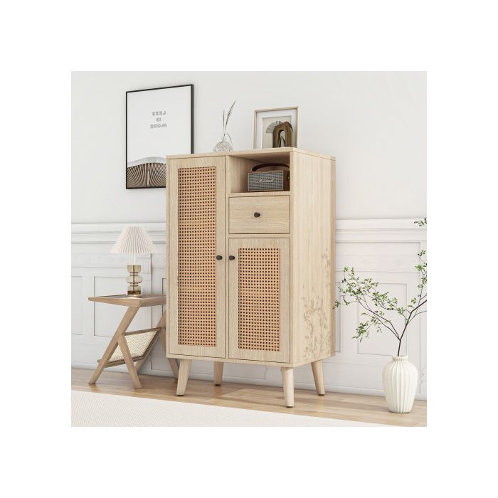 Buffet - MUVOE - 2 portes en rotin - 1 tiroir - Bois massif - 60x40x101cm