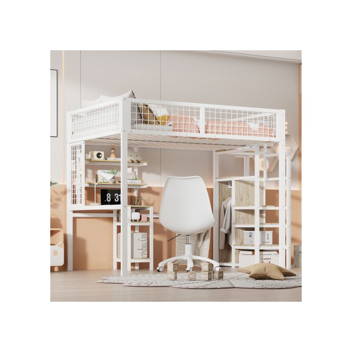 Lit mezzanine - MUVOE - 140x200 - Métal blanc - Échelle de sécurité - Table d'ordinateur intégrée