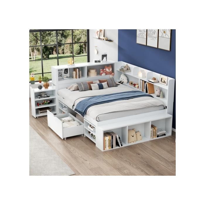 Kinderbett - MUVOE - 140x200 cm - Weiß - Lattenrost - Integrierter Stauraum