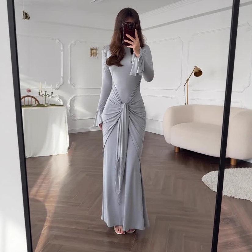 2025 Sommer Satin Hohe Taille Raffung Langes Kleid für Damen