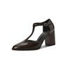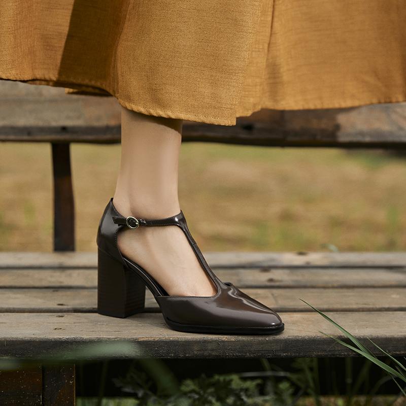 Mode 2025 Neue Mode Lackleder T-förmige Pumps Runde Zehenpartie Quadratischer Absatz Strohschuhe Französische High Heels Ein-Knopf Baotou Sandalen