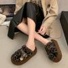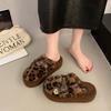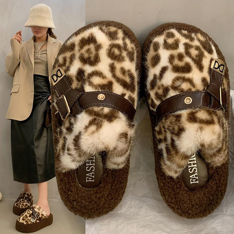 Herbst und Winter 2025 Koreanische Version High-End Home Office Leopardenmuster Dicksohlige Gürtelschnalle Taschenkopf Einwortige flauschige Baumwollpantoffeln Damen