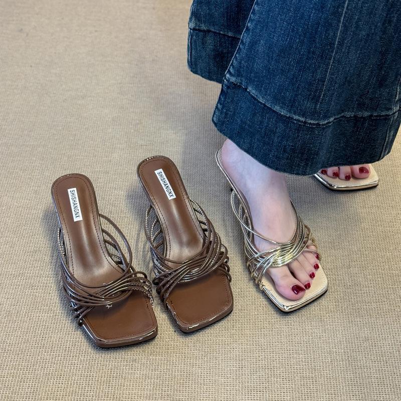 Außen Temperament quadratischer Kopf dünner Riemen dünner Absatz Damen Sommer coole Hausschuhe schöne französische Kreuzung hoher Absatz offene Zehen römische Sandalen