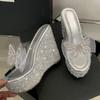 Eilyken Sommer Neues Design Kristall Pailletten Stoff Zehenoffene Hausschuhe Plateau Keilabsätze Damen PVC Transparente Schuhe