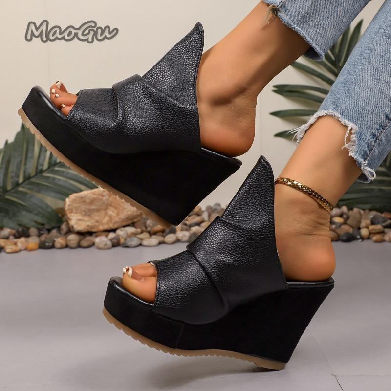 Sommer Damen Keilsandalen Schwarzes Leder Slip-on High Heel Pantoletten 10CM Absatz Plateausandalen Rutschfest Fischmaul Pantoletten Schuhe