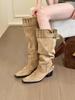 Aber Kniestiefel Kinder 2025 Herbst und Winter Khaki Wildleder spitze Stiefel Kinder dicker Absatz dünne plissierte Stulpenstiefel