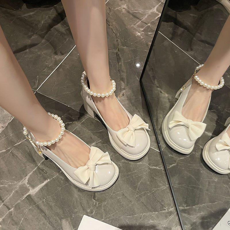 Mary Jane kleine Lederschuhe Damen Frühling und Sommer neu Französische Schleife Perlenkette Damenrock dicker Absatz hohe Absätze