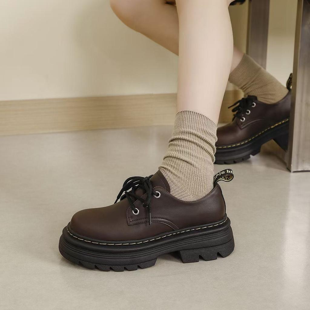 Schwarze kleine Lederschuhe mit dicker Sohle für Damen, vielseitige Studentenschuhe im britischen Stil, warme Schuhe für den Winter, neu