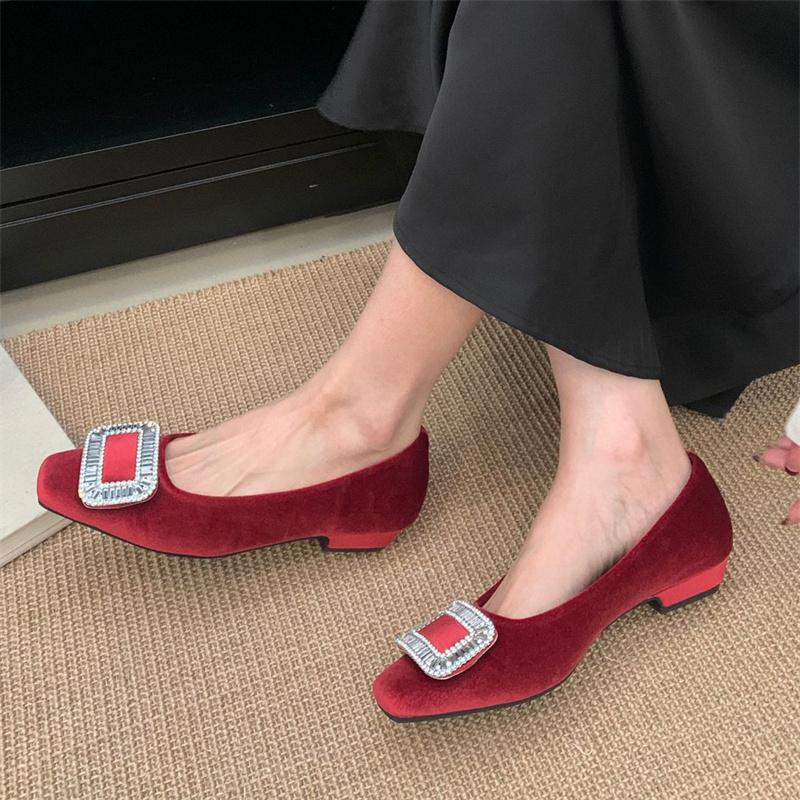 IPPEUM Ballet Flats Rhinestone Shoes For Women 2025 New Square Toe Red Velvet Ballerina Shoes Women
