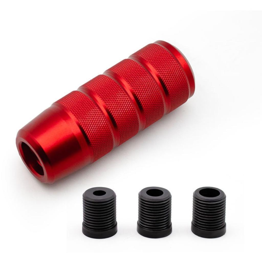 Product Details: Shift knob body, material: aluminum alloy, length: 9.5 cm, diameter: 3.6 cm, weight: approximately 200 g. Includes three adapters: hardened plastic, sizes: 8 mm, 10 mm, 12 mm, colors: black, titanium blue, silver, gray, blue, and red. The screw-in design allows for easy installation by simply tightening the appropriate set screws.