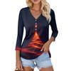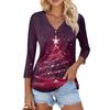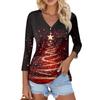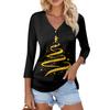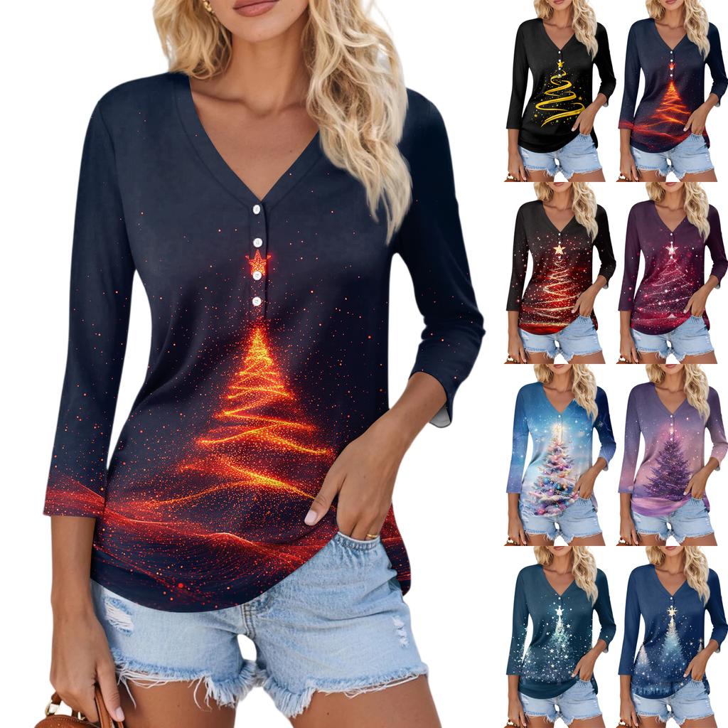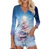 Damen Casual Mode Sexy Bequem Weihnachts-Print V-Ausschnitt Knopf Dreiviertelarm Oberteil